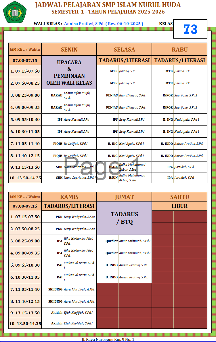 | No. | Wali Kelas | Kelas | KBM Semester 1 |